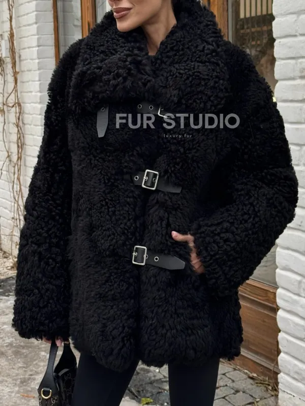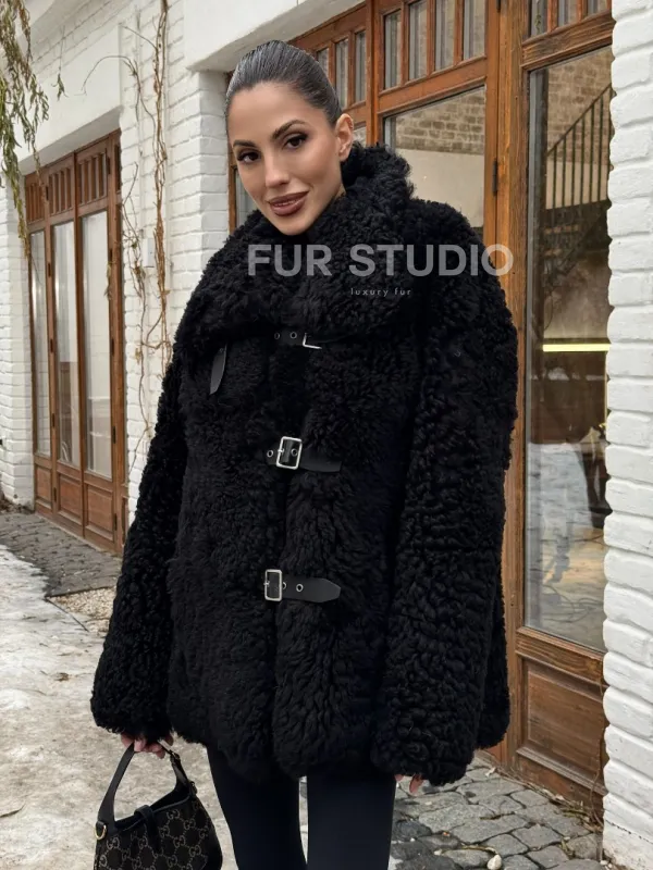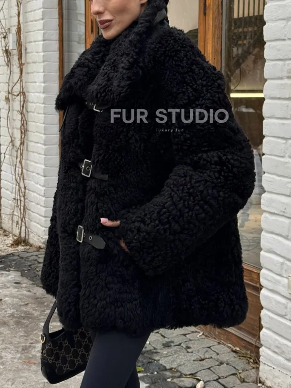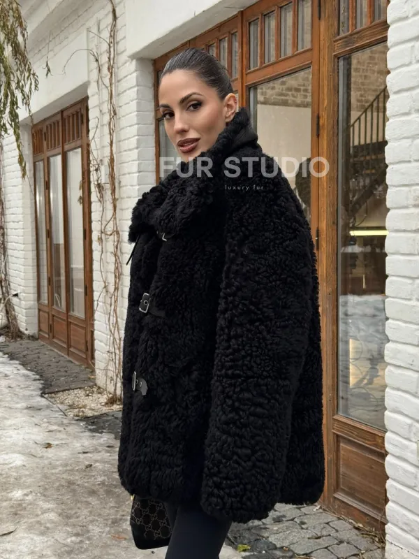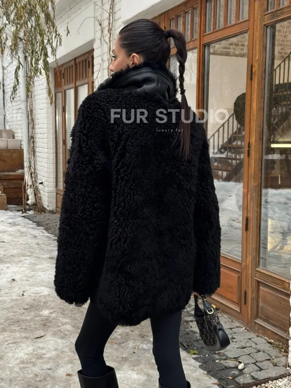 Черная дубленка средней длины из овчины тиградо " Дафлкот " 101494