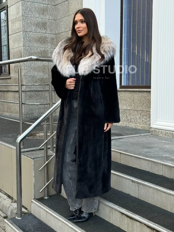 Мех данной шубы аукционная норка , цвет черный. Предлагается в размерах от 42 до 52. Длина модели 125-130 см, что выгодно подчеркивает фигуру девушек. Эта модель идеально подойдет для девушек и женщин, предпочитающих роскошные натуральные меха.