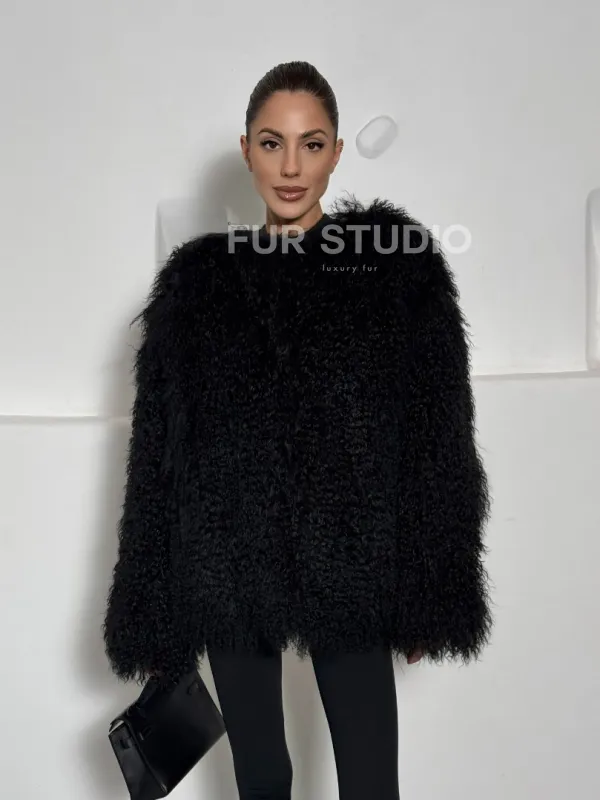 Черная шуба из меха ламы воротник шанель 101496