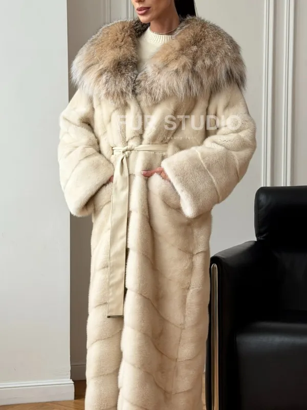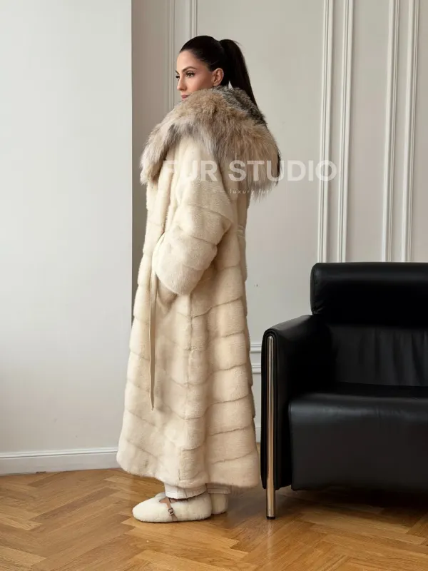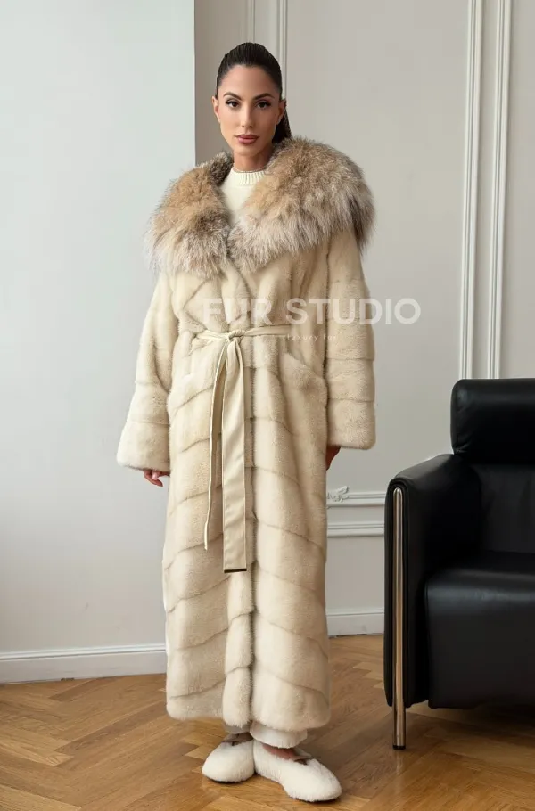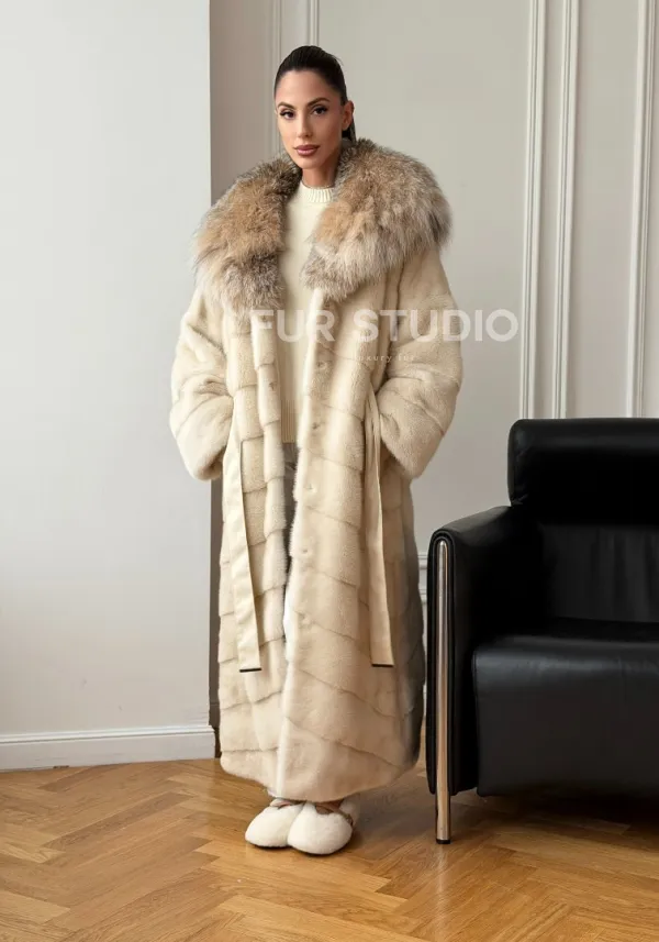 Мех данной шубы аукционная норка, цвет бежевый. Предлагается в размерах от 42 до 52. Длина модели 125-130 см, что выгодно подчеркивает фигуру девушек. Эта модель идеально подойдет для девушек и женщин, предпочитающих роскошные натуральные меха.