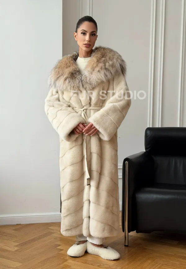 Длинная норковая шуба - капюшон из меха рыси 102713