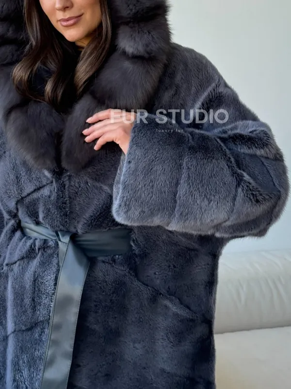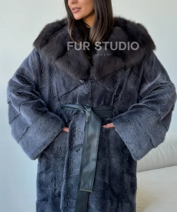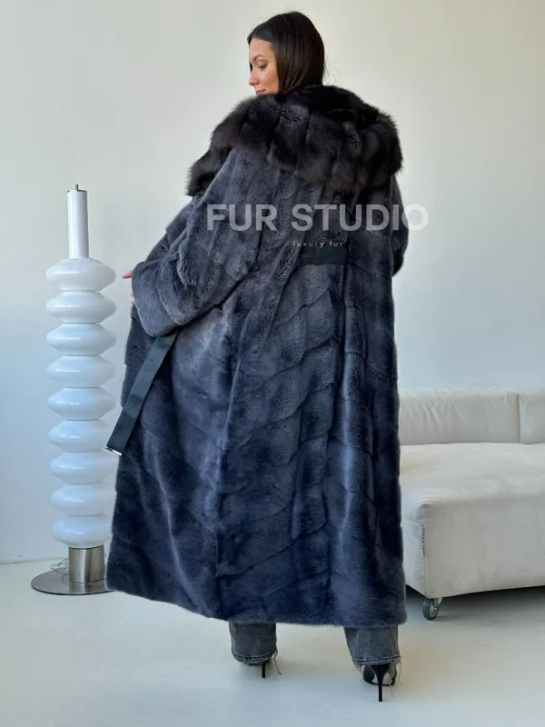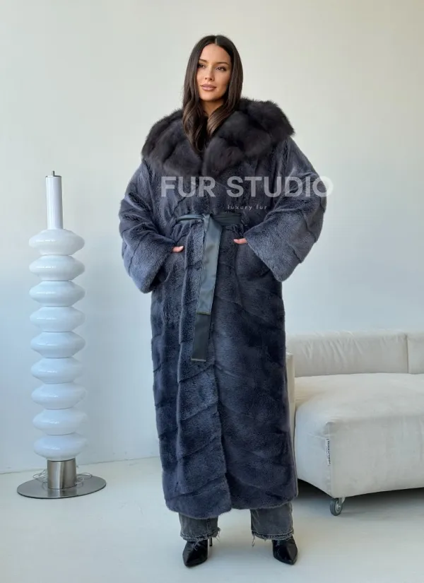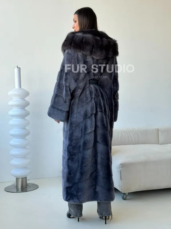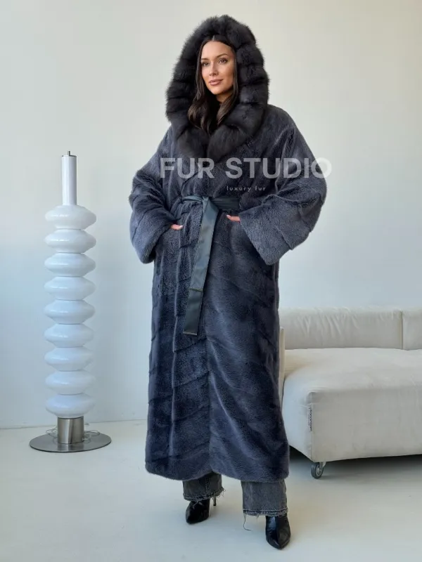 Длинная норковая шуба с куницей капюшон 102500