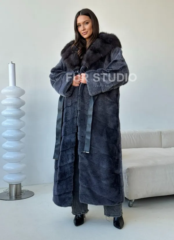 Мех данной шубы аукционная норка, цвет синий. Предлагается в размерах от 42 до 50. Длина модели 125-130 см, что выгодно подчеркивает фигуру девушек. Эта модель идеально подойдет для девушек и женщин, предпочитающих роскошные натуральные меха.
