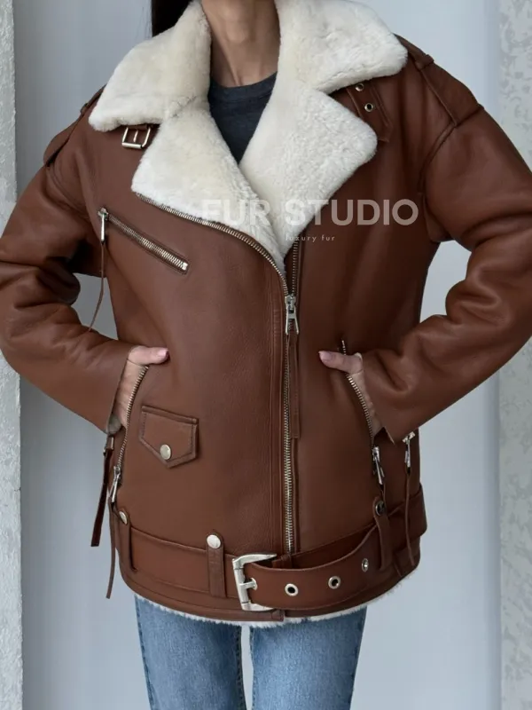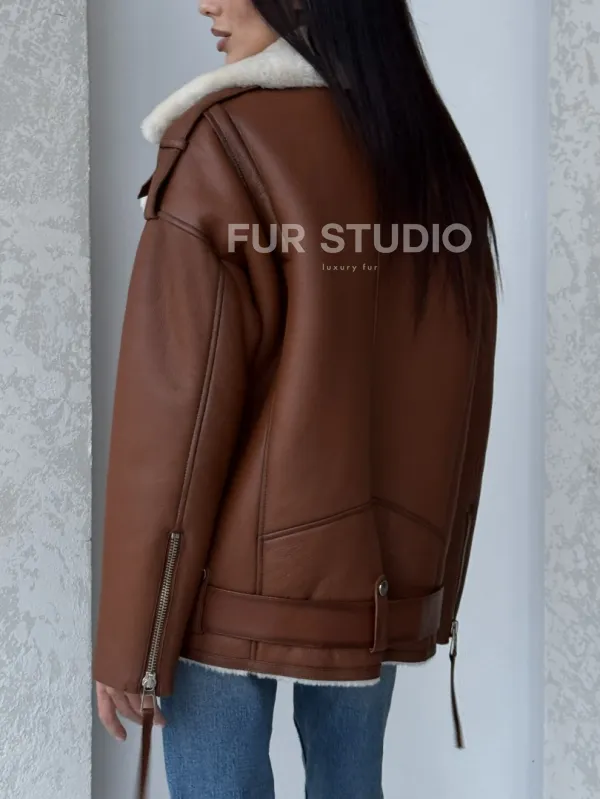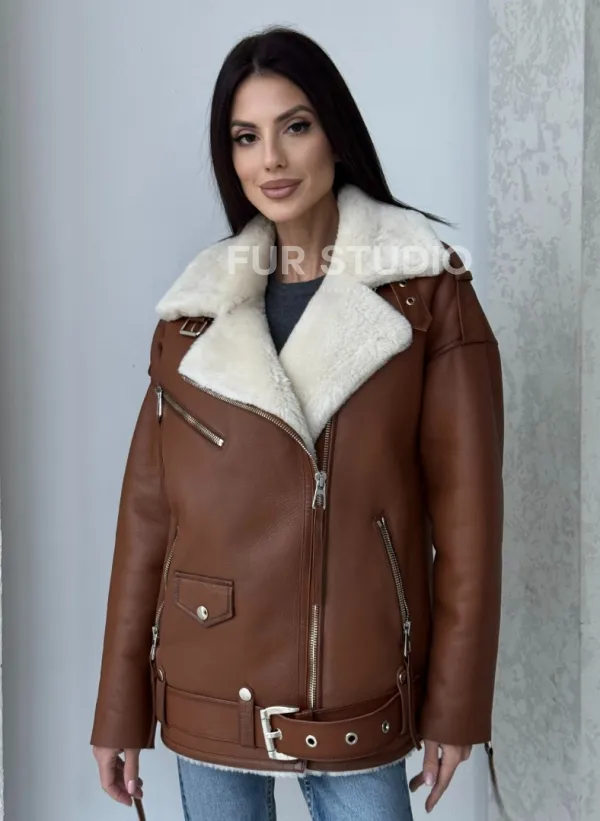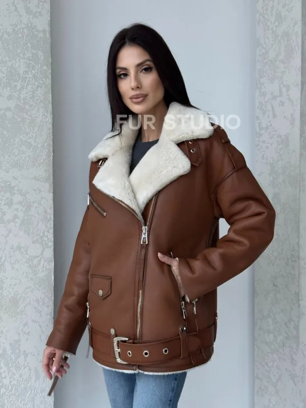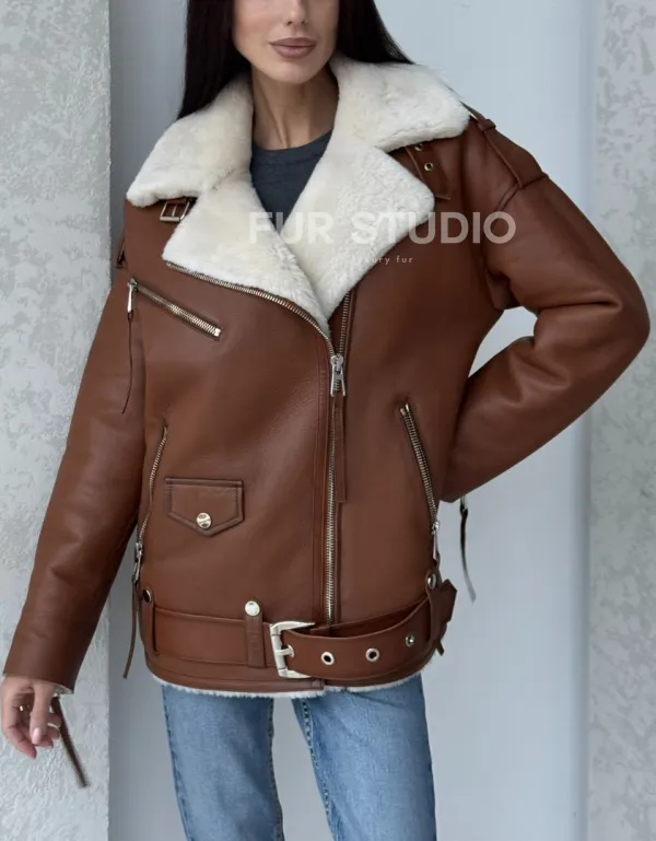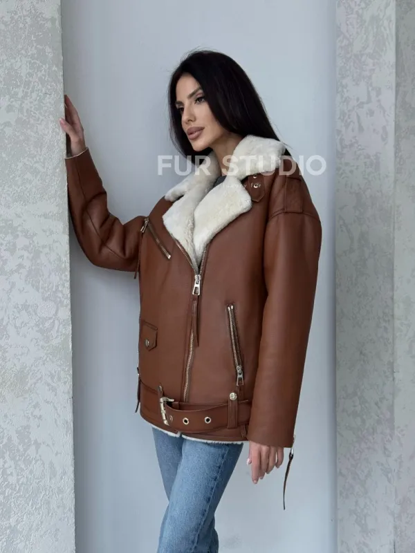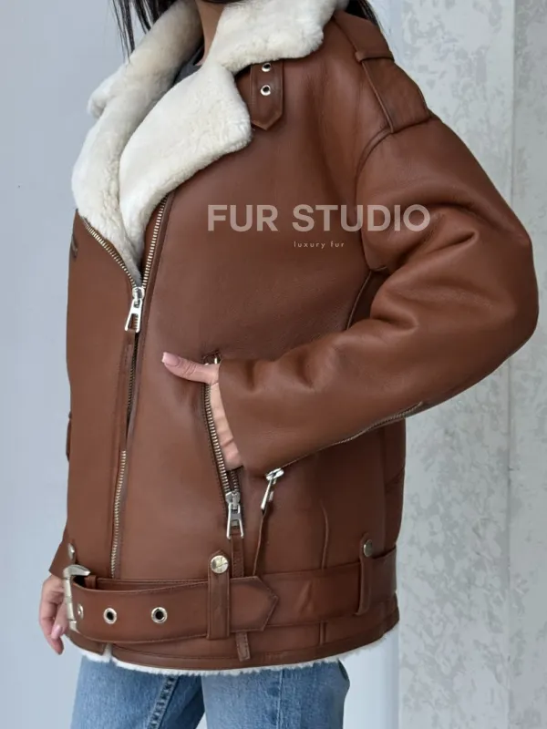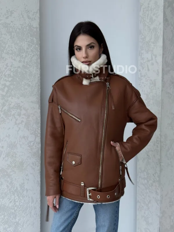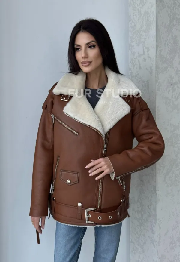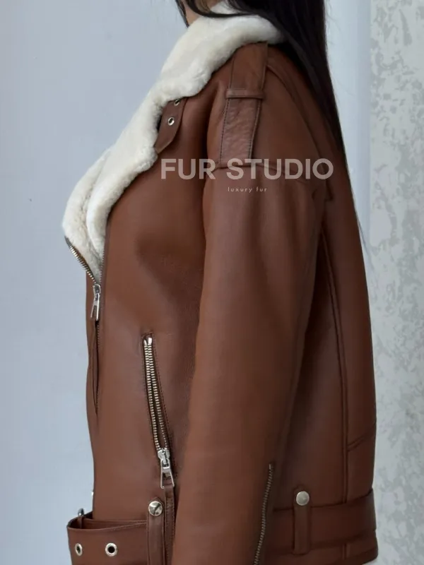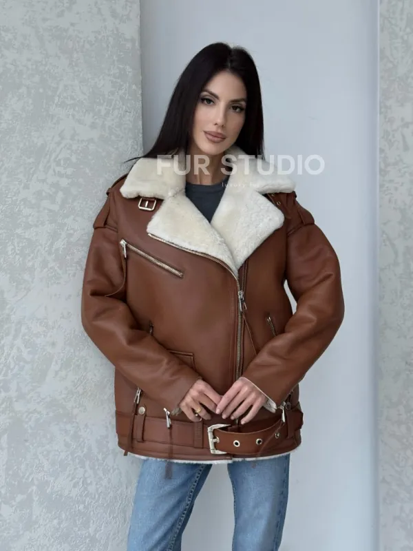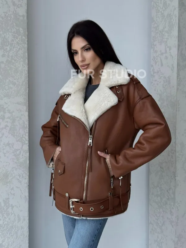 Оптимальная длина комфортна при носке. Прямой крой не сковывает движений, что удобно при вождении машины. Стильный пояс на бедрах добавляет нотку экстравагантности в образ. Модель сочетается с базовым гардеробом. Шикарный воротник не даст замерзнуть шее в непогоду. Фермуары на рукавах смотрятся оригинально. Купить дубленку авиатор из натуральной кожи в цвете виски могут женщины, которые любят выглядеть дерзко, но при этом изысканно.