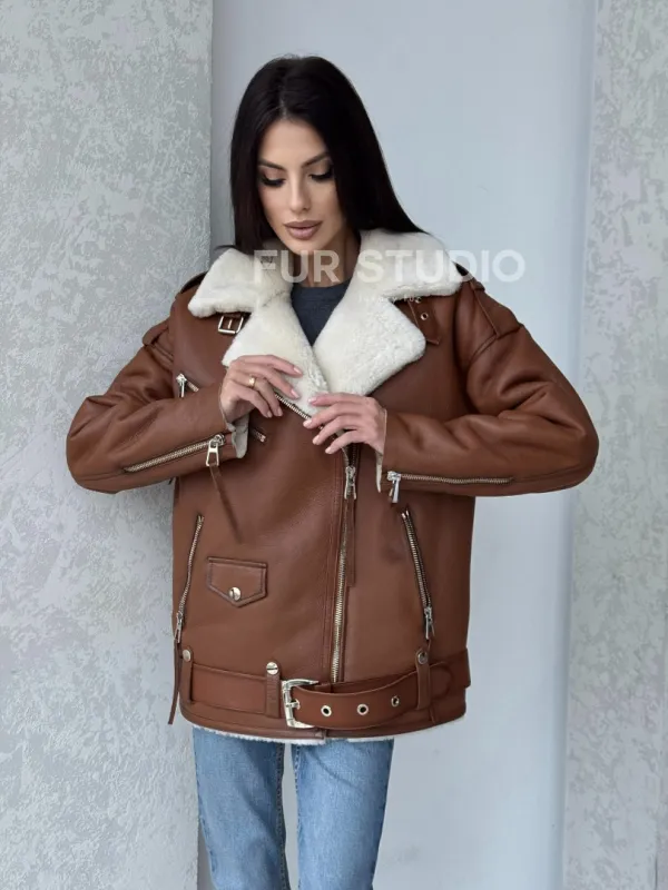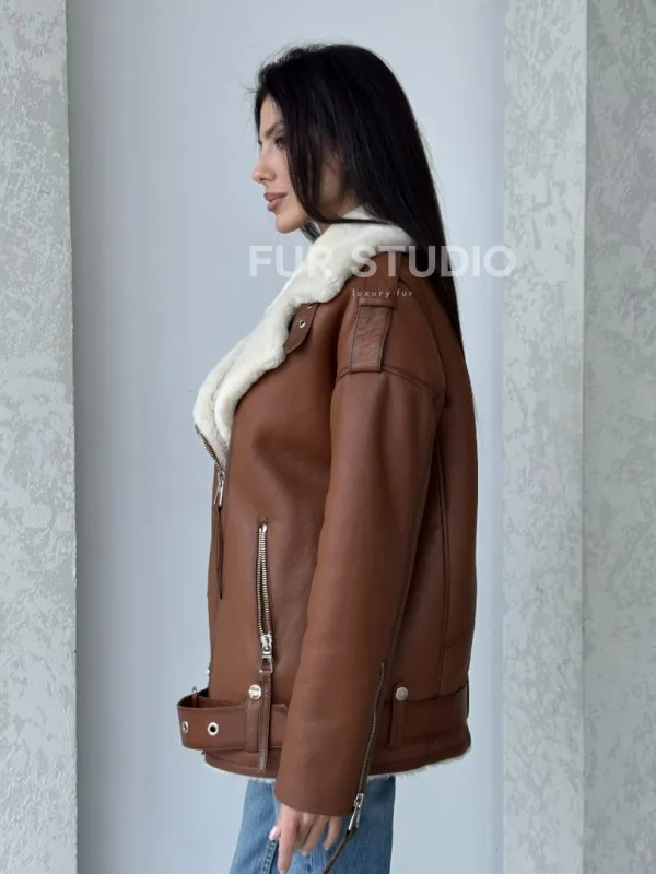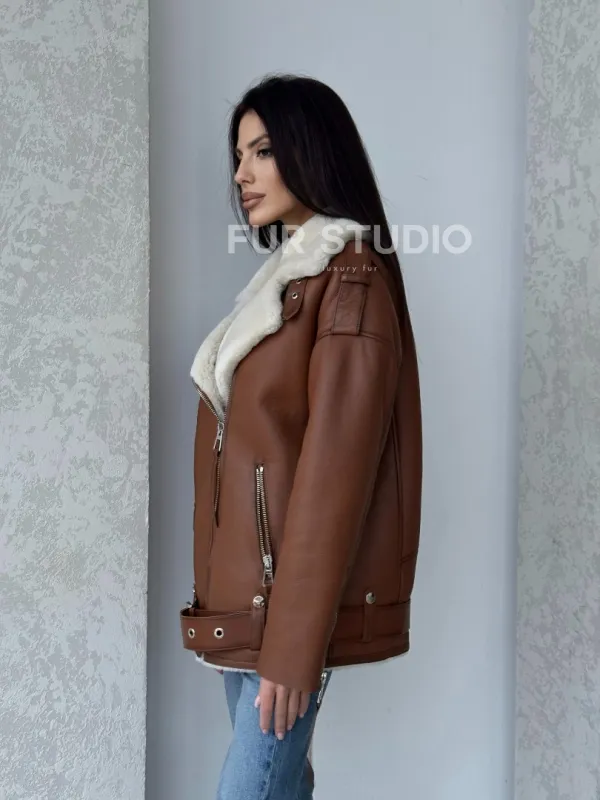 Дубленка авиатор из натуральной кожи в цвете виски – выбор современных девушек. Модель – тренд этого сезона. Мех овчины позаботится о комфортной температуре тела в прохладное время года. Необычный цвет виски подчеркнет оттенок волос и кожи владелицы. Качество изделия будет радовать хозяйку долгие годы.