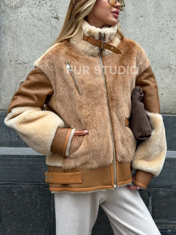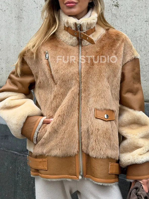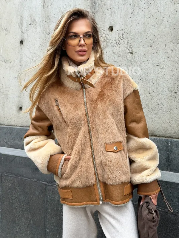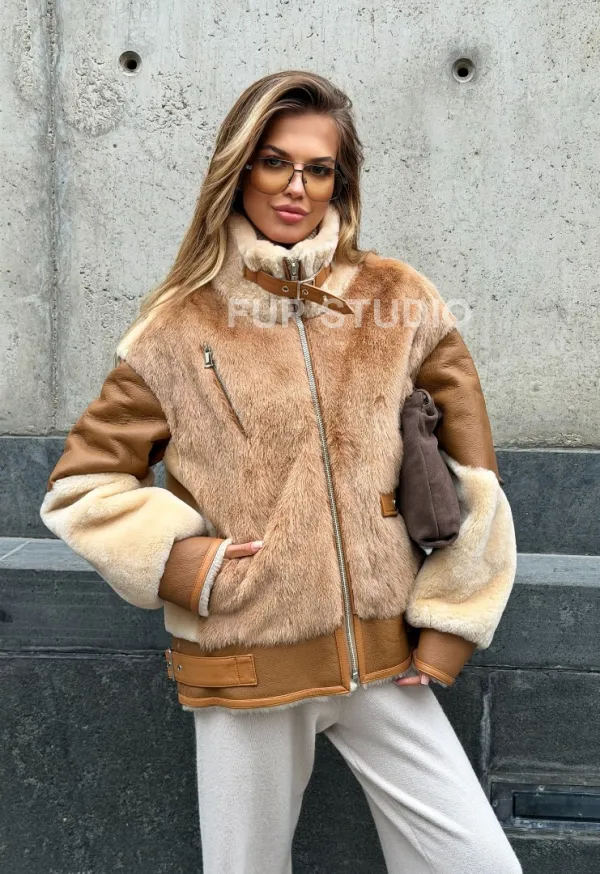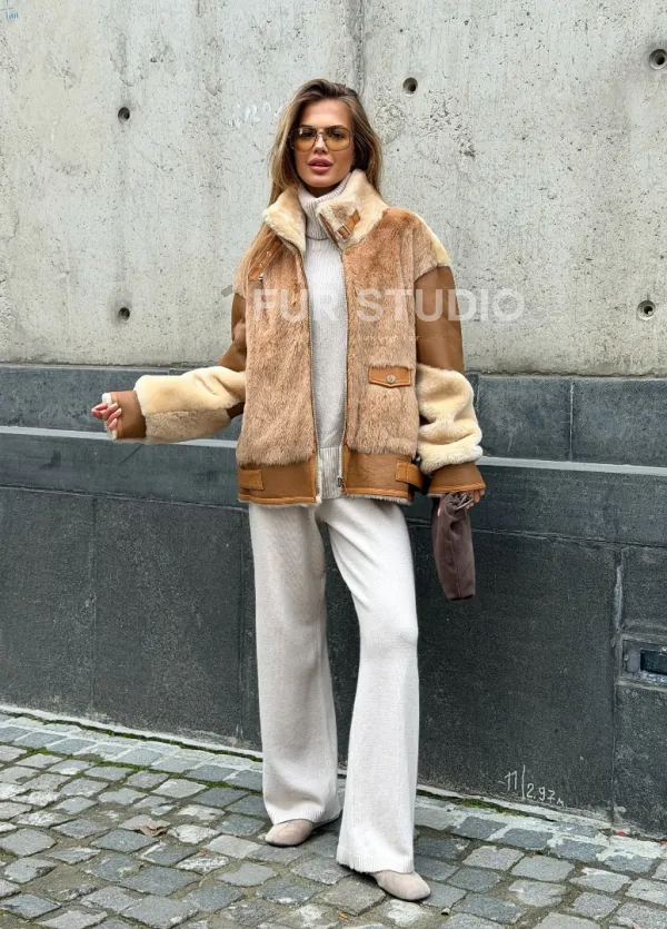 Комбинированная дубленка из овчины и норки 102540