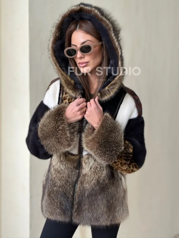 Комбинированная норковая куртка с капюшоном 100725