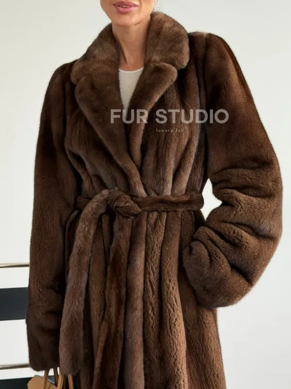 Прямая шуба из норки с поясом 102645