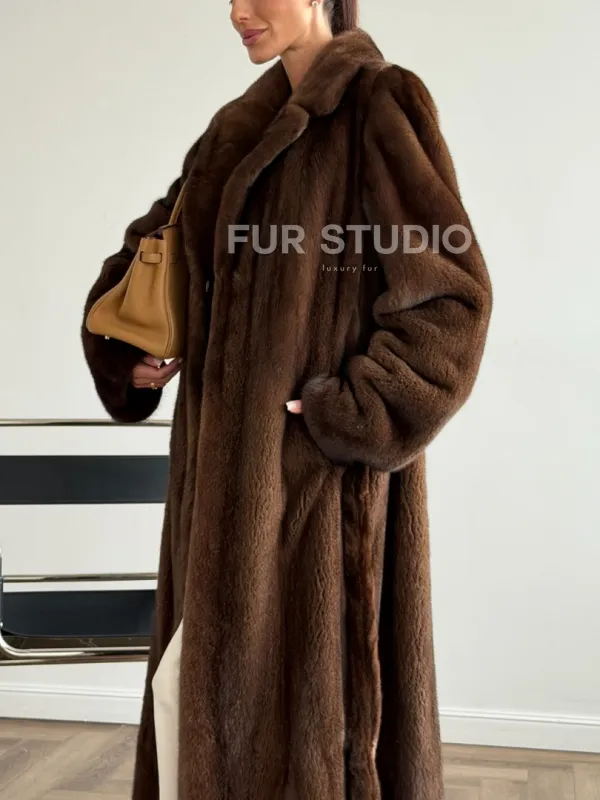 Мех данной шубы аукционная норка , цвет коричневый. Предлагается в размерах от 42 до 48. Длина модели 125-130 см, что выгодно подчеркивает фигуру девушек. Эта модель идеально подойдет для девушек и женщин, предпочитающих роскошные натуральные меха.