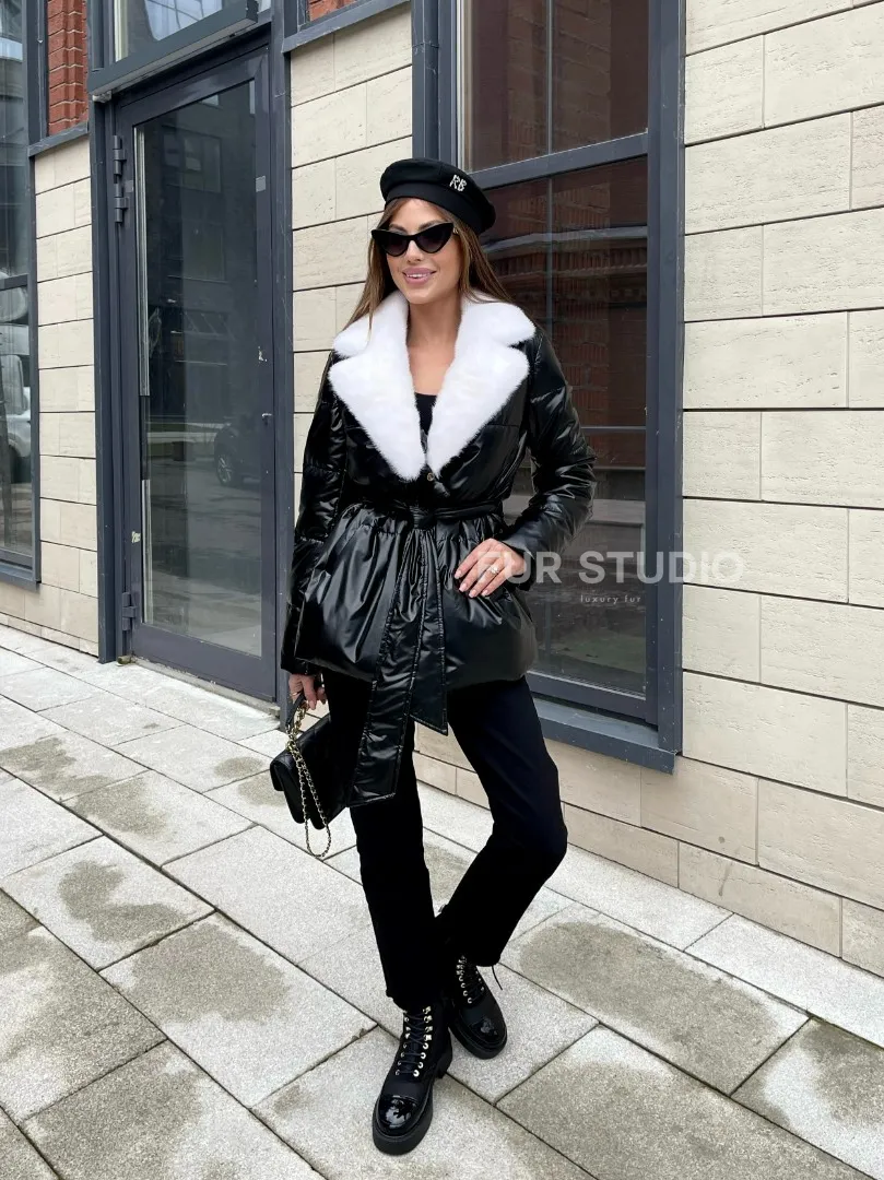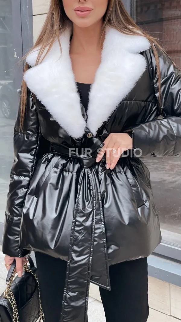Пуховик с мехом белой норки в черном цвете 100402