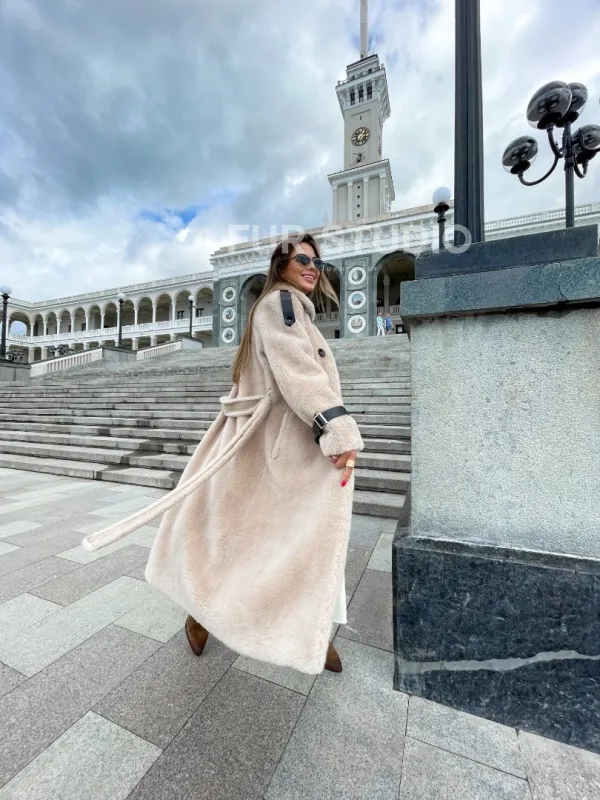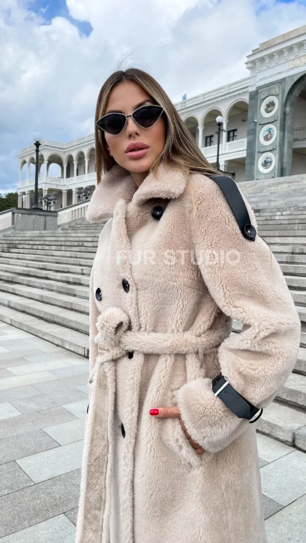 Шуба из натуральной шерсти в молочном оттенке выбор девушек с отличным вкусом. Изделие выглядит стильно, лаконично. Натуральная шерсть позаботится о комфортной температуре тела в прохладное время года. Необычный крой зрительно удлинит силуэт и подчеркнет достоинства фигуры. Оригинальный пояс очертит талию. Глубокие карманы согреют ручки в непогоду.