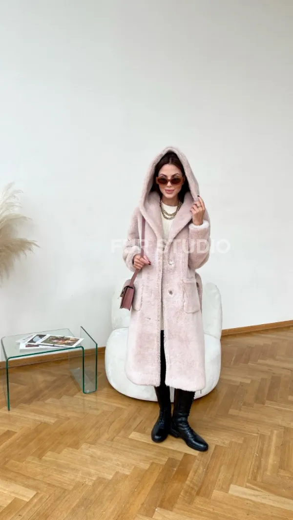 Удобные карманы не дадут замерзнуть ручкам. Нежный цвет придаст образу женственности и гармонии. Добавьте к lookу брендовую сумочку и необычную обувь - вы будете неотразимы. Купить шубу из натуральной шерсти с капюшоном под пояс могут девушки, которые хотят выглядеть изысканно и со вкусом вне зависимости от времени года.
