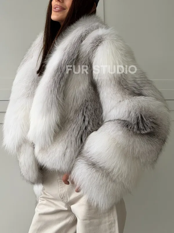 Мех данной шубы лиса, цвет белый. Предлагается в размерах от 42 до 46. Длина модели 50-55 см, что выгодно подчеркивает фигуру девушек. Эта модель идеально подойдет для девушек и женщин, предпочитающих роскошные натуральные меха.
