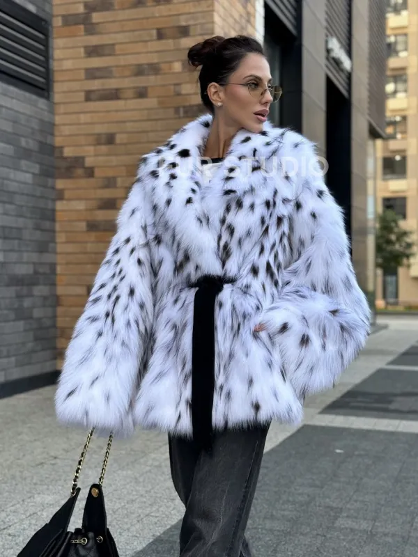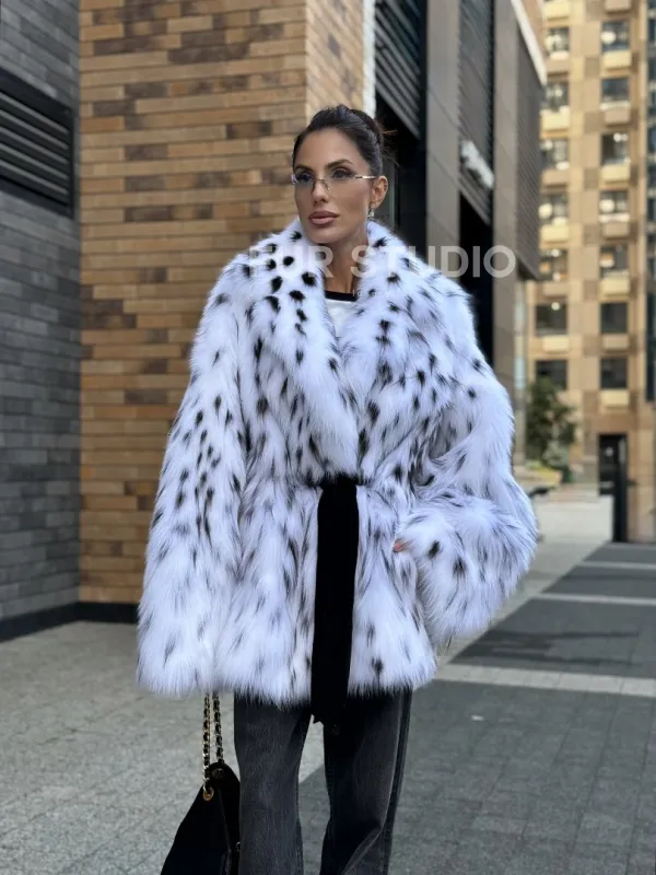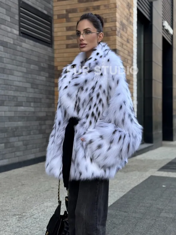 Шуба - Белая лиса с вшитыми пятнами из рыси PREMIUM качество, фасон «летучая мышь» легкая и стильная, созданная специально для уверенной в сете активной роскошной женщины. Даже в длине до середины бедра шуба из лисы подарит уют и тепло в любую погоду: в ней комфортно прогуливаться в морозные и ветреные дни, причем не только от такси до ресторана.
