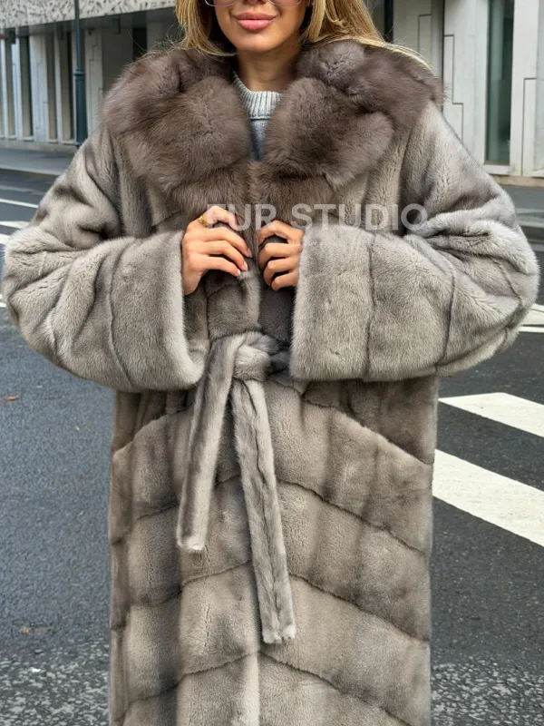Мех данной шубы аукционная норка , цвет серый. Предлагается в размерах от 42 до 48. Длина модели 115-120 см, что выгодно подчеркивает фигуру девушек. Эта модель идеально подойдет для девушек и женщин, предпочитающих роскошные натуральные меха.