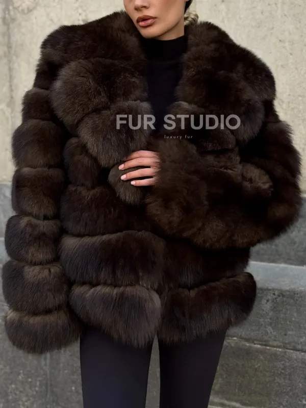 Мех данной шубы финский песец, цвет коричневый. Предлагается в размерах от 42 до 48. Длина модели 60-65 см, что выгодно подчеркивает фигуру девушек. Эта модель идеально подойдет для девушек и женщин, предпочитающих роскошные натуральные меха.