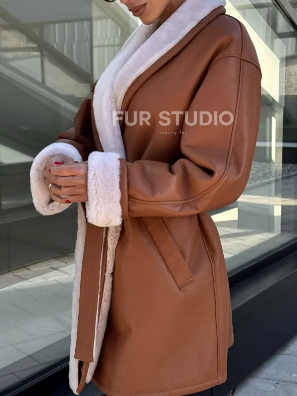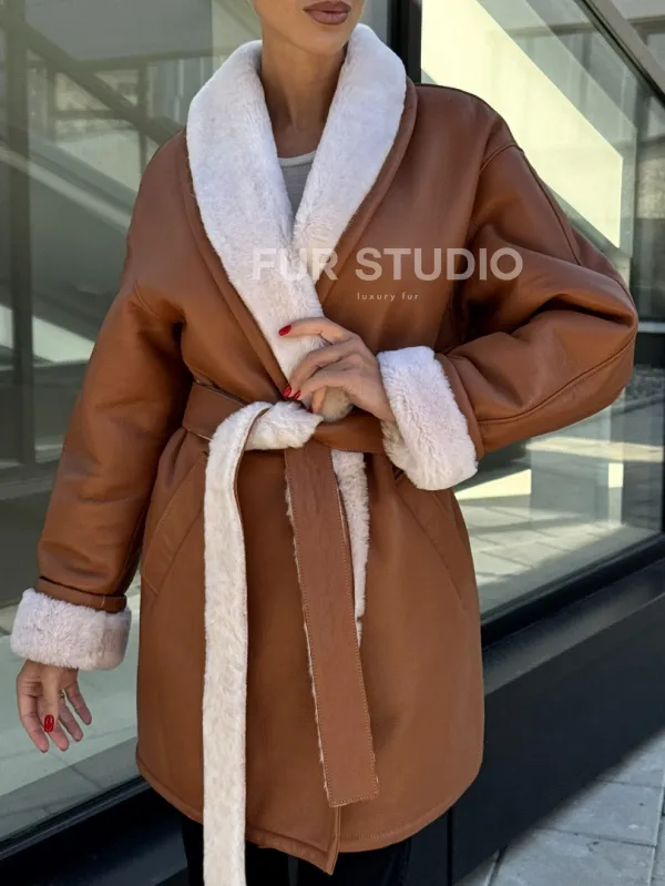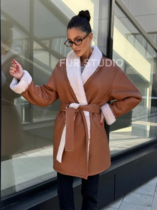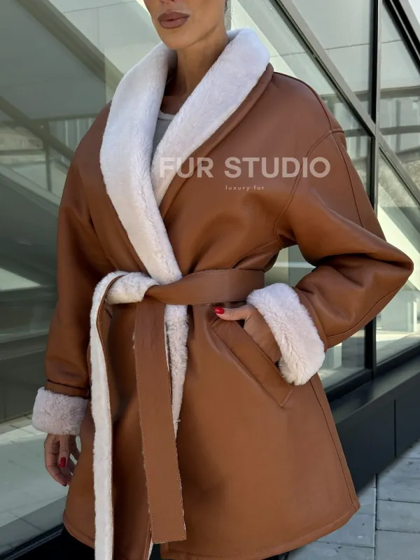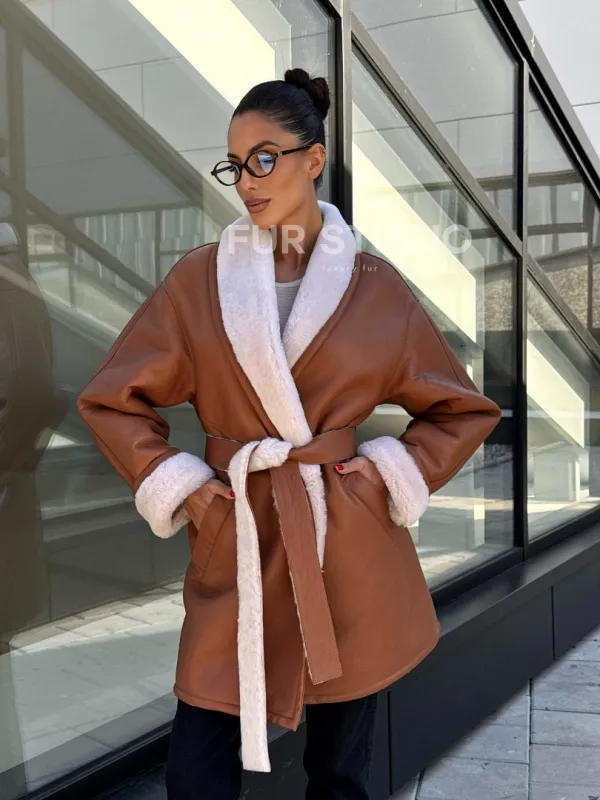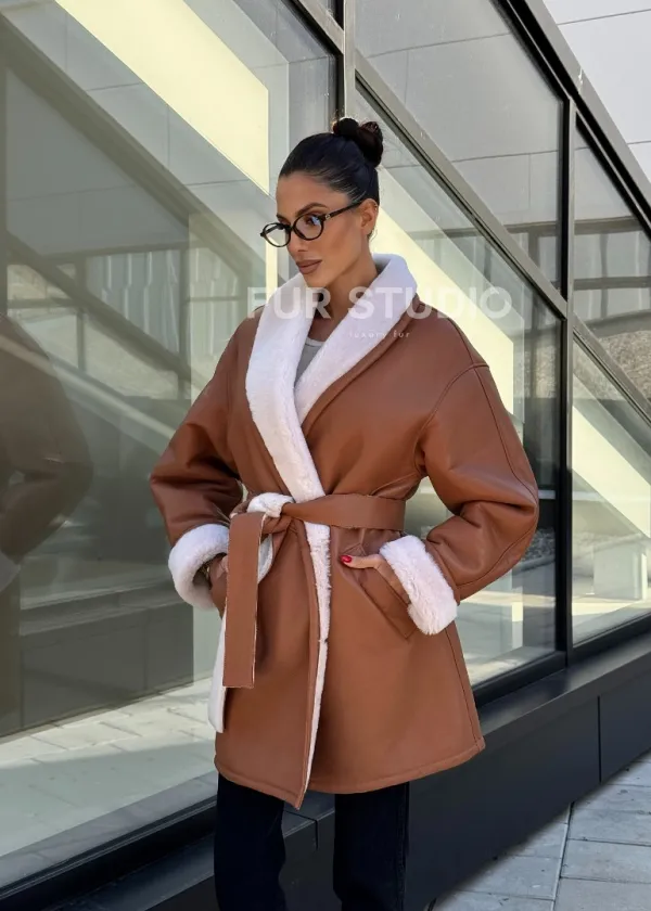 Женская дублёнка на запах с поясом - цвет кэмел 101160